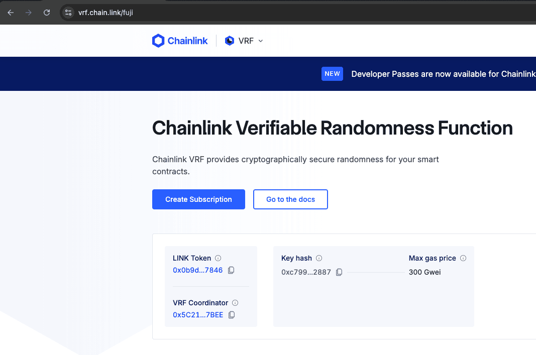 To create a subscription, go to the Chainlink VRF Subscription Manager on the network where you plan to request VRF (e.g., Avalanche Fuji). You can access the manager here: VRF | Subscription Management for Fuji.